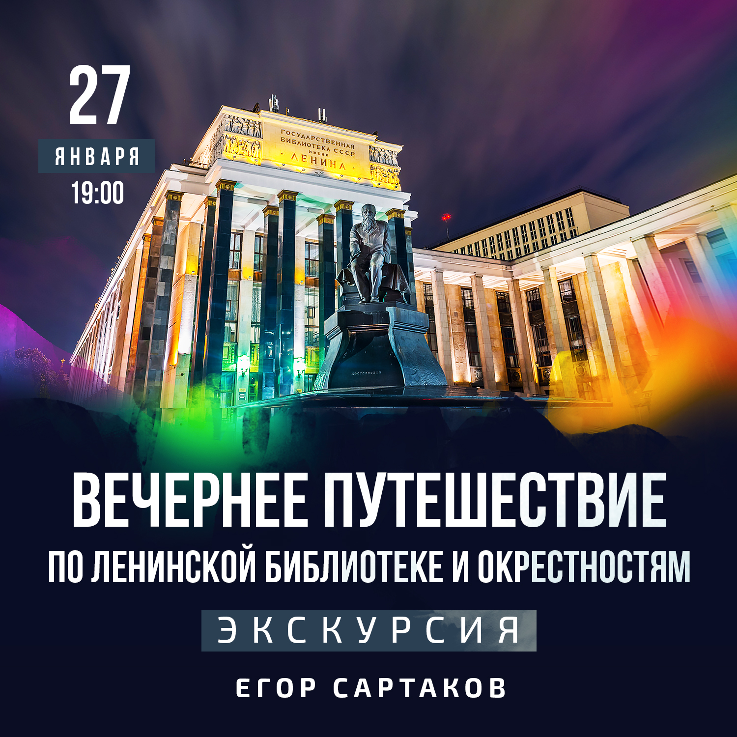В фильме Эльдара Рязанова «Гараж» герои провели ночь в Зоологическом музее. Мы же предлагаем ещё более увлекательное путешествие: провести ночь в главной библиотеке России — РГБ (бывшая Ленинская). Экскурсию начнет Егор Сартаков в сумерках на Площади революции, а затем мы вместе с экскурсоводом РГБ совершим двухчасовое путешествие по библиотеке, когда все читатели уже покинут главное здание. Посетим читальные, выставочные залы и подземный переход в Дом Пашкова.